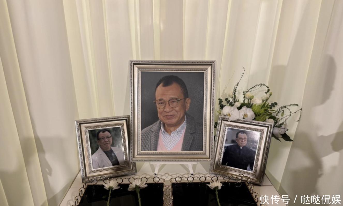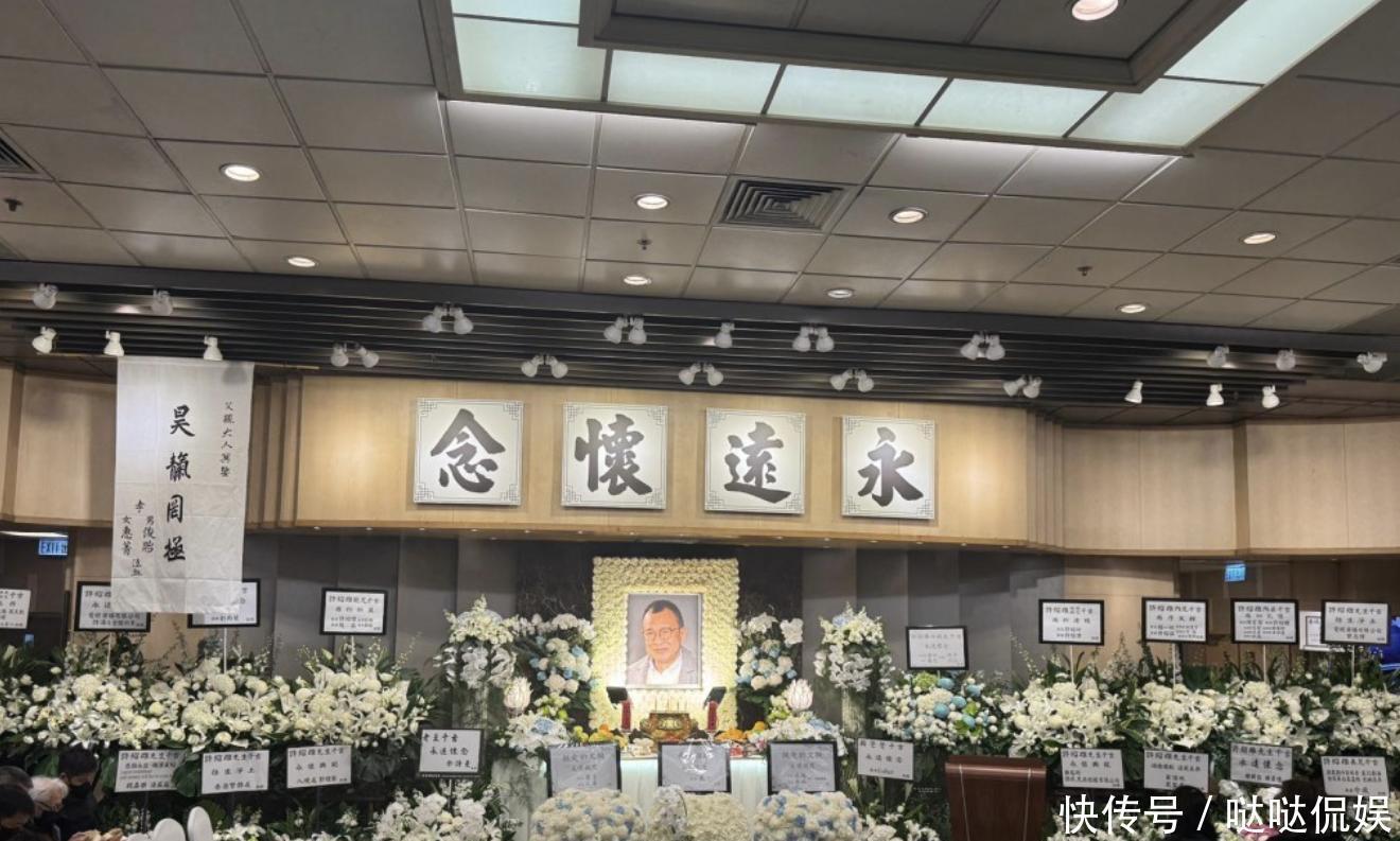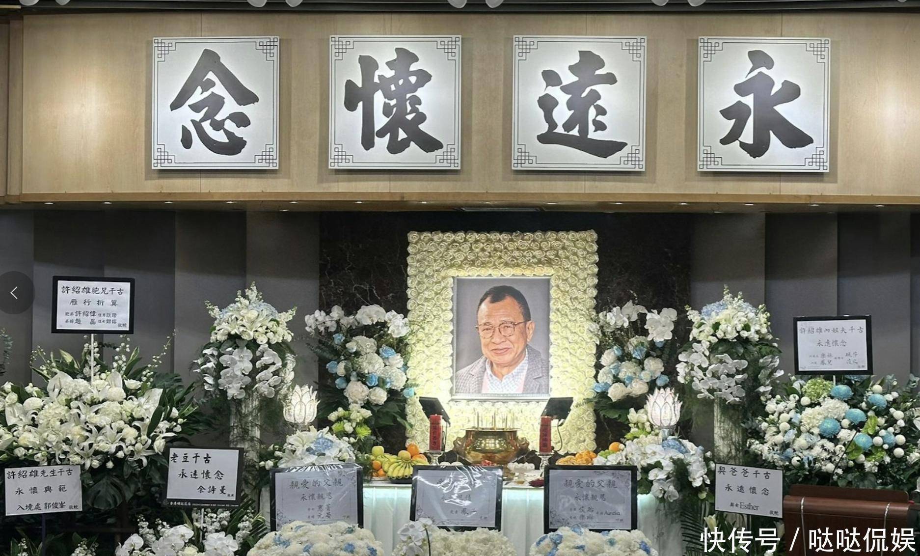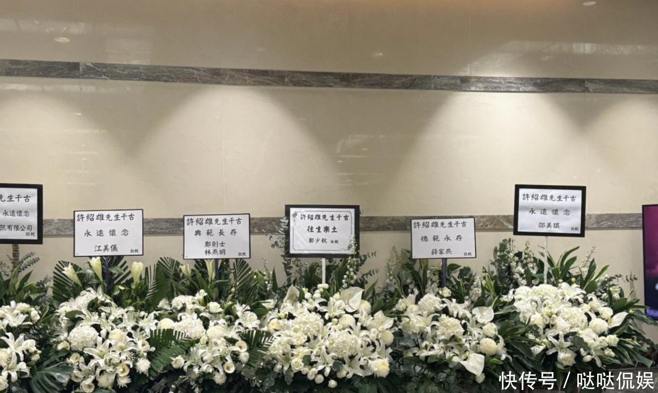 在许绍雄的遗照的一侧有一条祭文布,上面写着“父亲大人冥鐾 昊天罔极 孝女惠菁 男俊贻泣血”。除了花牌、遗照、花圈之外,现场的多台电视机还滚动播放着许绍雄生前的影视作品,以及得奖画面,还有与好友的合照,以此纪念许绍雄。